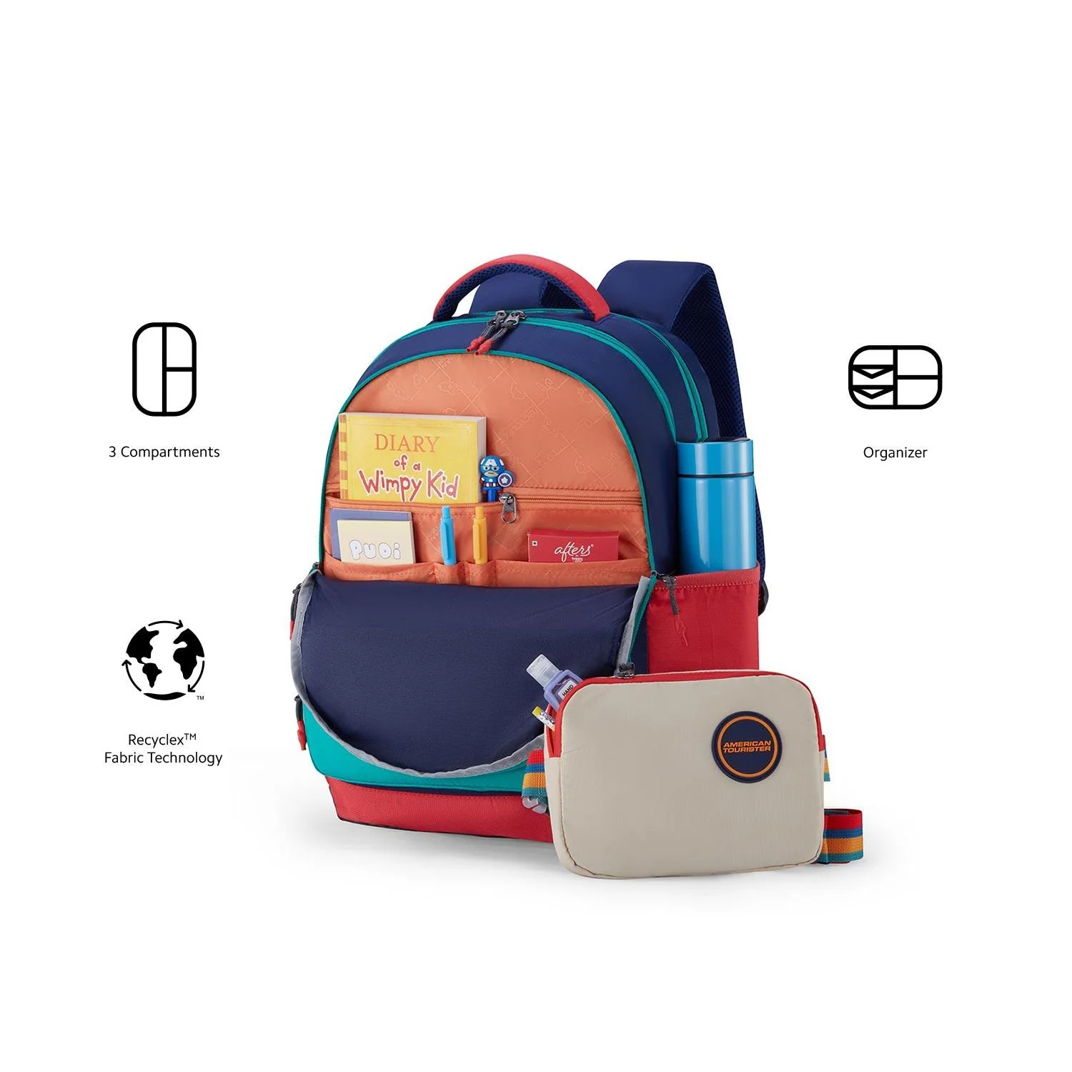 Introducing the Toodle 3.0 backpack: Comfort, sustainability, personalization, versatility, and weather protection combined. ATErgo system ensures optimal weight distribution and ergonomic support for enhanced comfort. Recyclex Material Technology lining is made from 100% recycled material for eco-friendliness and durability. ATYounique personalization feature includes a detachable fanny pack for style expression. Plus, with a 3-compartment design and organizer section, it keeps belongings neatly organized, including pens and stationery. Additionally, it comes with a built-in rain cover for weather protection, making it an ideal accessory for everyday use in any conditions.